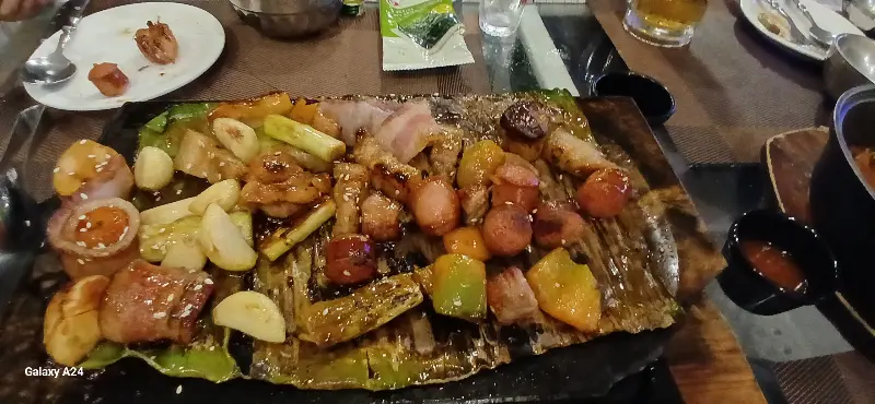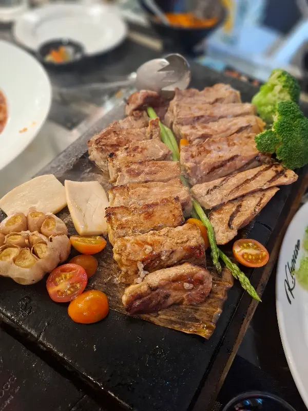 케이하우스는 다양한 메뉴를 자랑합니다. 스테이크, 해물라면, 떡볶이, 김치볶음밥, 짜파게티 등 한국인이 사랑하는 메뉴는 물론, 현지 식재료를 활용한 특별한 요리까지 맛볼 수 있습니다. 특히 스테이크는 마지막 한 조각까지 따뜻하게 즐길 수 있도록 특별한 불판에 제공되어 감동을 더했습니다. 육즙 가득한 스테이크는 입안에서 사르르 녹아내리는 듯했고, 함께 곁들여진 구운 마늘, 버섯, 방울토마토, 브로콜리, 아스파라거스는 풍성한 맛과 향을 선사했습니다.