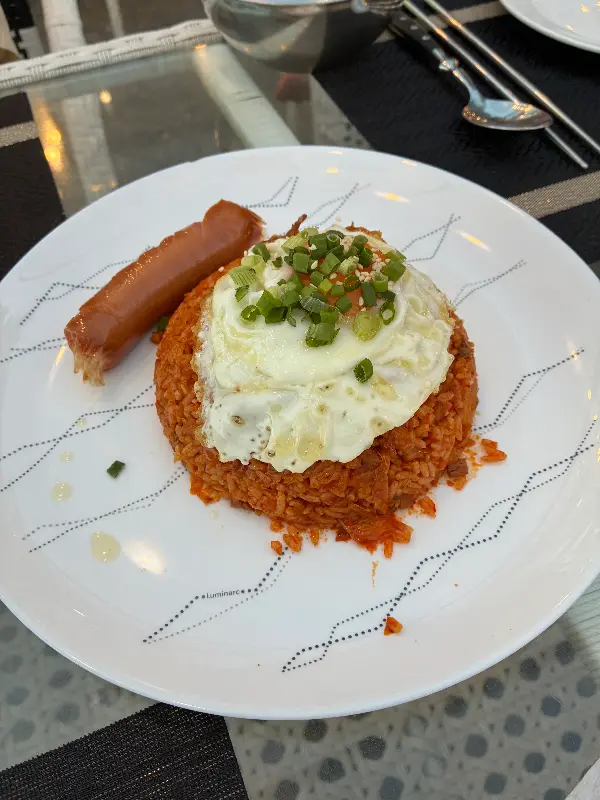 김치볶음밥 위에는 계란후라이가 톡! 소시지까지 곁들여진 완벽한 한 끼 식사.