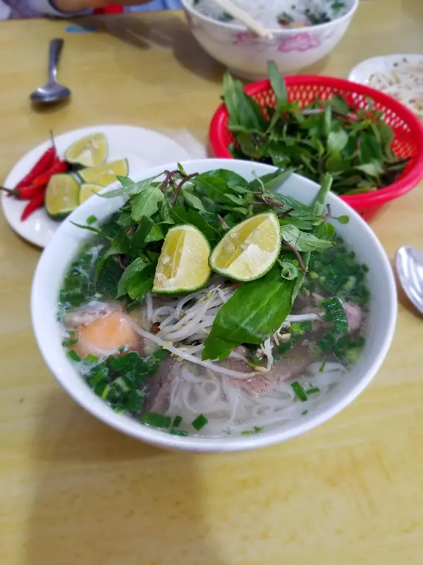 잠시 후, 김이 모락모락 나는 쌀국수가 테이블 위에 놓였습니다. 뽀얀 국물 위에는 푸짐한 고기와 계란 노른자가 올려져 있었고, 민트와 고수가 산처럼 쌓여 있었습니다. 붉은 고추와 라임 조각도 함께 나왔는데, 보기만 해도 군침이 돌았습니다.