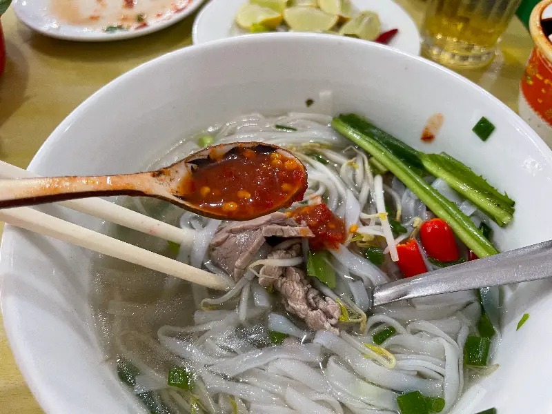 저는 쌀국수에 함께 나온 붉은 고추를 잘게 잘라 넣고, 라임즙을 살짝 짜서 넣었습니다. 그리고 테이블 위에 놓인 특제 매콤 양념을 조금 추가했습니다. 매콤한 양념이 쌀국수 국물에 풀리면서, 칼칼하면서도 깊은 맛이 더해졌습니다. 이것이 바로 제가 찾던 인생 쌀국수의 맛이었습니다. 땀을 뻘뻘 흘리면서도 멈출 수 없는 맛이었죠.