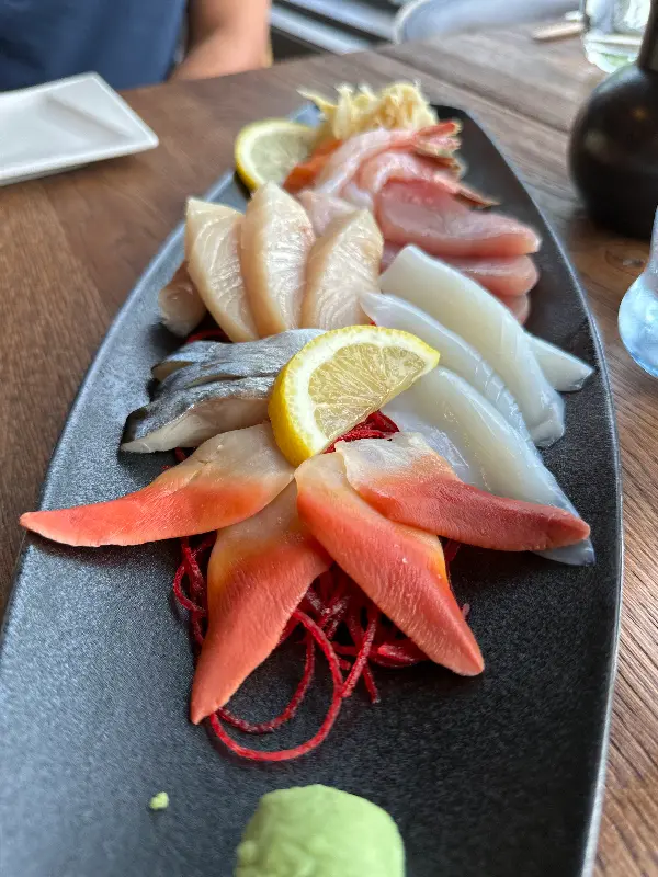 고민 끝에 ‘오늘의 사시미’를 주문했습니다. 잠시 후, 눈으로도 즐거운 아름다운 플레이팅의 사시미가 테이블 위에 놓였습니다. 붉은 참치, 주황색 연어, 흰색 도미 등 다채로운 색감의 선어회가 신선함을 뽐냈습니다. 리뷰에서 언급된 것처럼, “후지”는 활어 대신 선어회를 제공하는 듯했습니다. 선어회는 숙성 과정을 거쳐 더욱 깊은 풍미와 부드러운 식감을 자랑한다고 하죠.