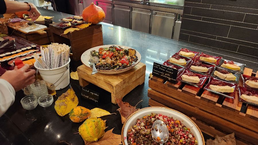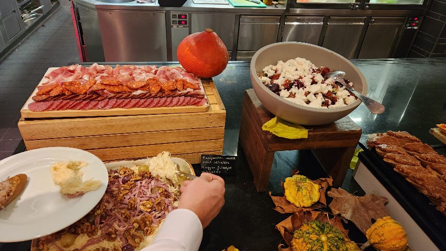 DNB에서는 종종 특별한 날을 위한 뷔페를 선보이는데, 내가 방문한 날은 운 좋게도 거위고기 특선 뷔페가 열리는 날이었다. 뷔페에 들어서자, 다채로운 음식들이 눈을 즐겁게 했다. 나무 상자에 정갈하게 담긴 햄과 살라미, 신선한 채소와 과일, 그리고 먹음직스러운 디저트까지, 뷔페 음식 하나하나에 정성이 느껴졌다.