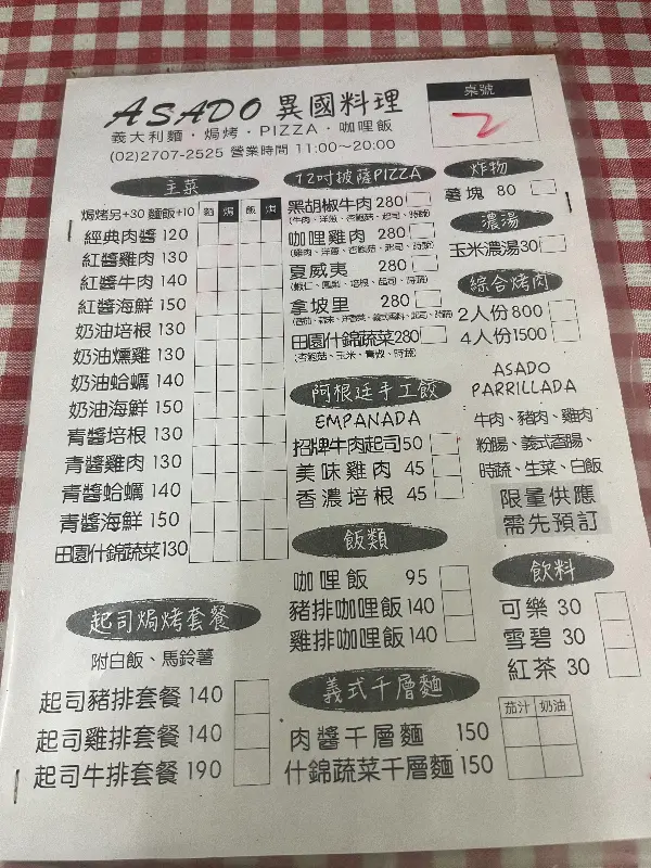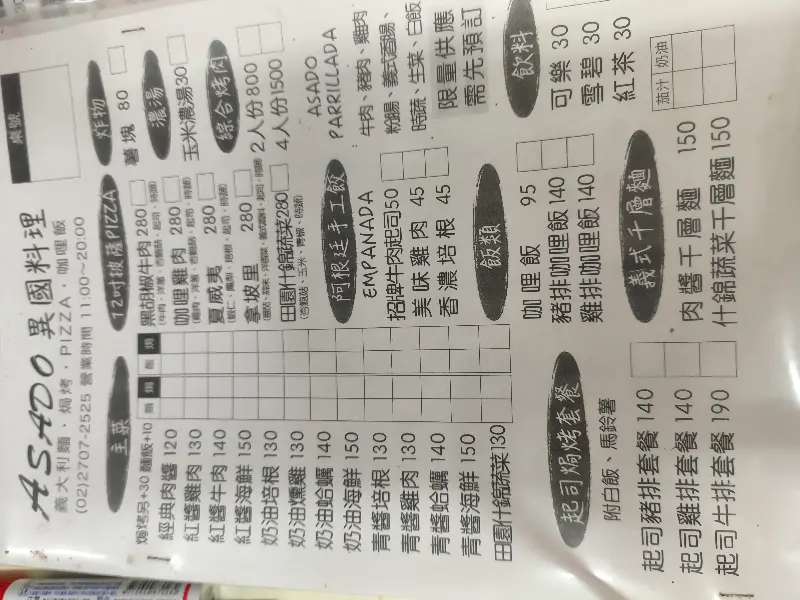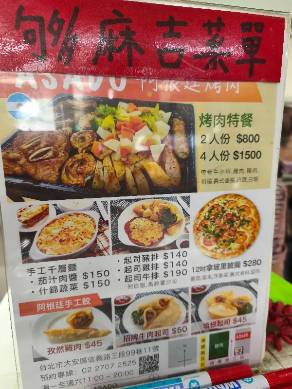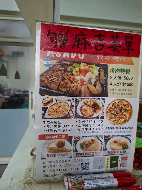 특히 눈에 띄는 것은 ‘아르헨티나 바비큐 특선’. 2인분에 800NTD, 4인분에 1500NTD라는 가격이 적혀 있다. 사진 속 바비큐는 다양한 부위의 고기와 채소, 소스가 푸짐하게 담겨 있어 보기만 해도 군침이 돈다. 메뉴판에는 아르헨티나식 만두인 엠파나다, 라자냐, 수제 라비올리 등 낯선 이름의 음식들도 보인다.