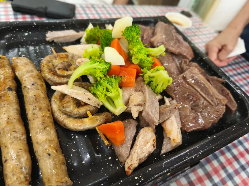 갈비, 소시지, 닭고기 등 다양한 종류의 고기와 구운 채소들이 먹음직스럽게 담겨 있고, 은은한 바비큐 향이 코를 자극한다. 예상보다 많은 양에 놀랐지만, 맛있는 냄새에 이끌려 얼른 포크를 들었다.