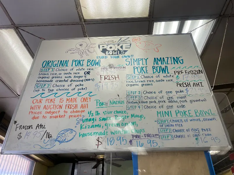 벽에 붙은 메뉴판을 살펴보니, Original Poke Bowl (Fresh)이 19.95달러, 10달러 콤보 볼 등 다양한 메뉴가 준비되어 있습니다. 와이키키 물가를 생각하면 정말 착한 가격이죠! 게다가 양도 푸짐해서, 든든하게 배를 채울 수 있다는 점도 매력적입니다.