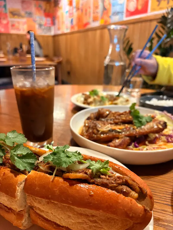 다음으로 맛본 슬로우 쿠킹 립은 입에 넣는 순간 뼈와 살이 부드럽게 분리될 정도로 완벽하게 조리되어 있었다. 달콤하면서도 짭짤한 소스가 립 전체에 깊숙이 배어 있어 풍부한 맛을 느낄 수 있었다. 함께 주문한 반미는 바삭한 바게트 빵 속에 신선한 채소와 돼지고기가 가득 들어 있어 훌륭한 조화를 이루었다. 특히, 반미에 곁들여진 매콤한 그린 칠리 소스는 느끼함을 잡아주면서 입맛을 돋우는 역할을 톡톡히 했다.