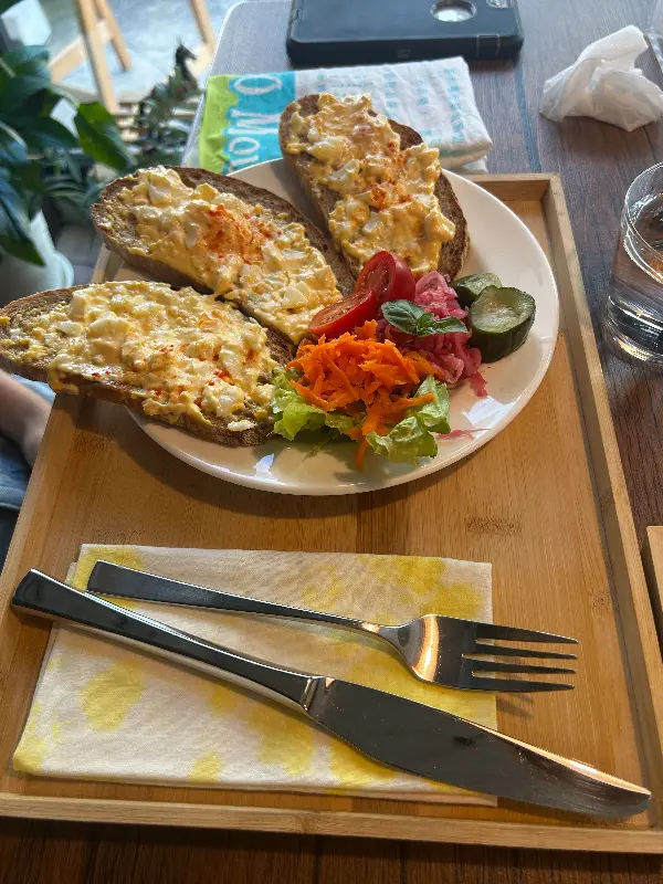메뉴를 펼쳐보니 다양한 종류의 케이크와 빵, 그리고 음료가 준비되어 있었습니다. 100% 글루텐 프리라는 사실이 믿기지 않을 정도로 다채로운 메뉴 구성이었죠. 계란을 곁들인 밥 토스트, 당근 케이크, 바닐라 아이스크림을 곁들인 구운 사과 토스트 등 평소에 쉽게 접하기 힘든 메뉴들이 눈에 띄었습니다.