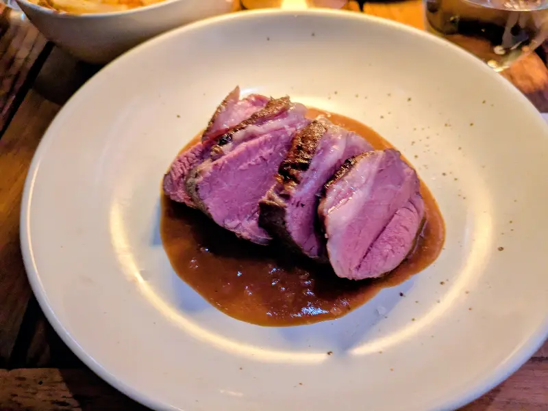 미디엄 레어로 완벽하게 구워진 양고기 엉덩이살, 부드러운 육질과 풍부한 육즙이 입안 가득 퍼져 나갑니다.