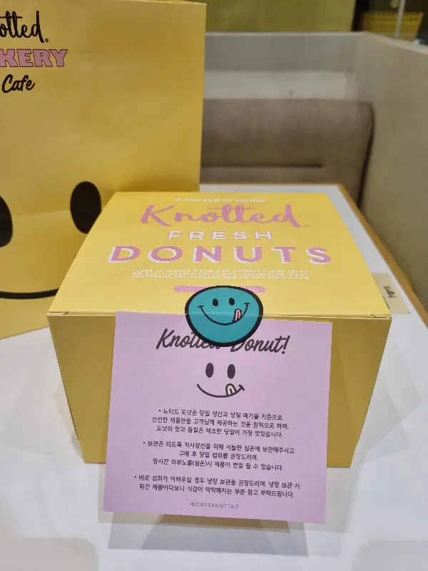 노티드 도넛의 상징인 스마일 캐릭터가 그려진 포장 박스는 선물용으로도 좋습니다.
