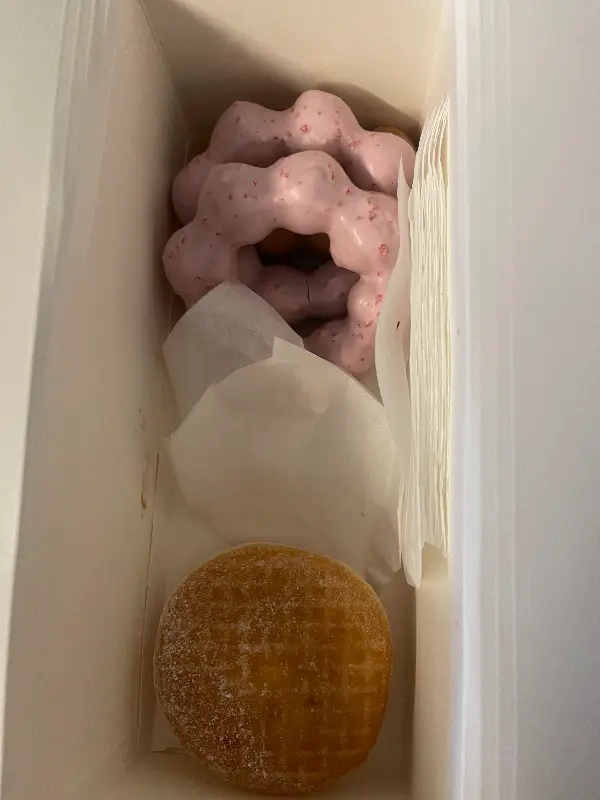 딸기 폰데링은 상큼한 딸기 맛과 달콤한 글레이즈의 조화가 훌륭했습니다. 쫄깃한 도넛과 아삭하게 씹히는 딸기 알갱이의 식감도 재미있었습니다. 초코 폰데링은 짙은 초콜릿 코팅이 인상적이었습니다. 달콤 쌉싸름한 초콜릿 맛은 폰데링의 쫄깃함과 완벽하게 어우러져 환상의 맛을 선사했습니다.