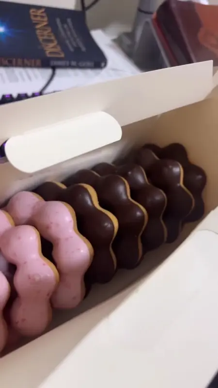 고민 끝에 저는 딸기 폰데링과 초코 폰데링을 선택했습니다. 상자를 열자 딸기 향이 은은하게 퍼져 나갔습니다. 핑크빛 코팅 위에는 딸기 알갱이가 콕콕 박혀 있어 더욱 먹음직스러워 보였습니다. 한 입 베어 무는 순간, 입안 가득 퍼지는 쫄깃함에 감탄했습니다. 폰데링 특유의 찰진 식감은 다른 도넛에서는 느낄 수 없는 특별함이었습니다.