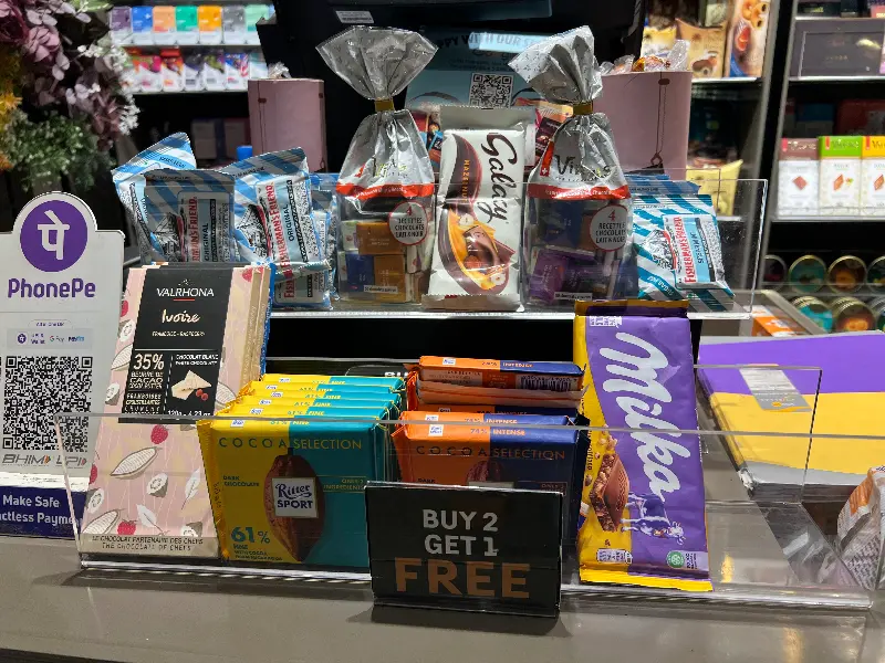 다양한 종류의 초콜릿이 보기 좋게 진열되어 있어 눈길을 사로잡습니다. ‘BUY 2 GET 1 FREE’ 문구가 더욱 구매욕을 자극하네요.
