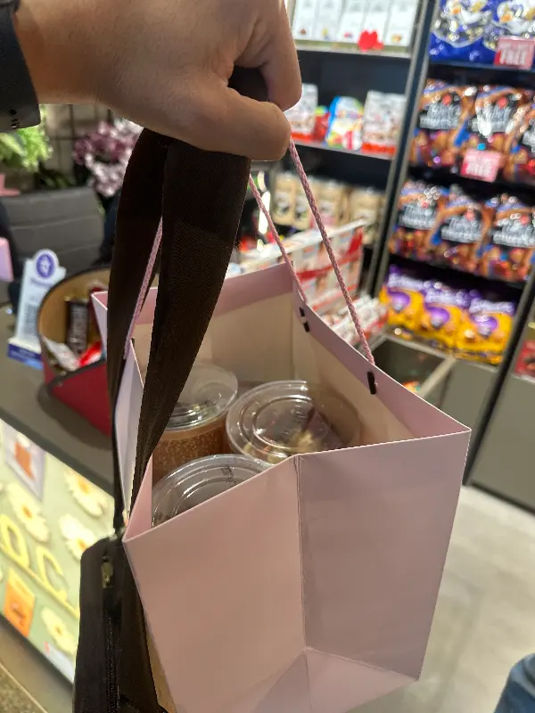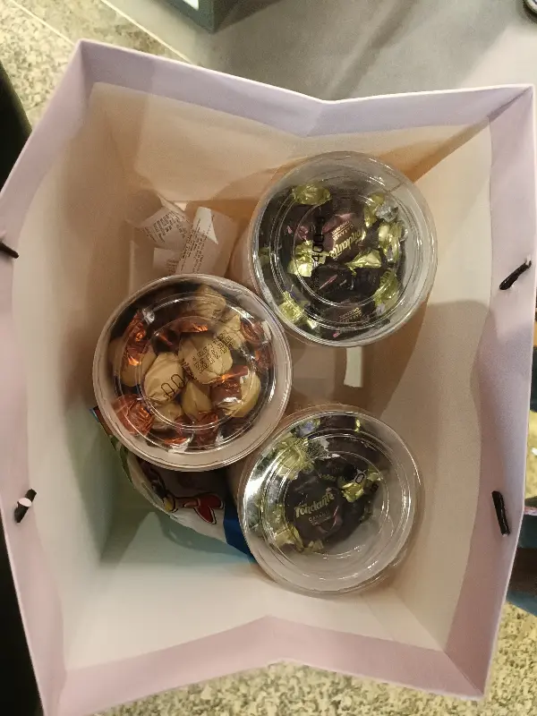 쇼핑백에 담긴 초콜릿. 여행의 설렘을 더해주는 기념품입니다.