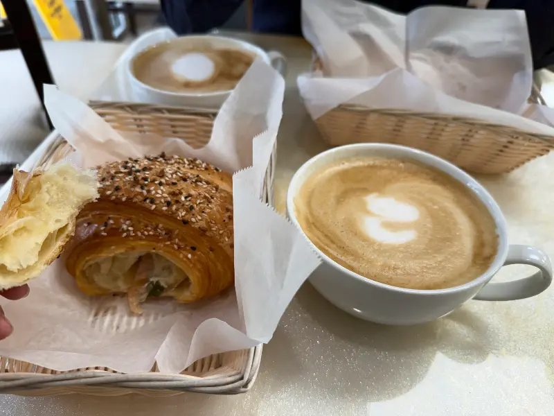 르 파리 프렌치 베이커리에서는 짭짤한 맛과 달콤한 맛을 모두 경험할 수 있습니다. 따뜻한 칠면조 할라피뇨 크루아상은 짭짤하면서도 매콤한 맛이 일품입니다. 크루아상의 가볍고 바삭한 식감과 칠면조의 풍미, 할라피뇨의 매콤함이 완벽하게 어우러져 잊을 수 없는 맛을 선사합니다. 아내는 바나나 캐러멜 크레페를 주문했는데, 폭신하고 달콤한 크레페는 입안에서 사르르 녹아내리는 듯한 행복감을 선사했습니다.