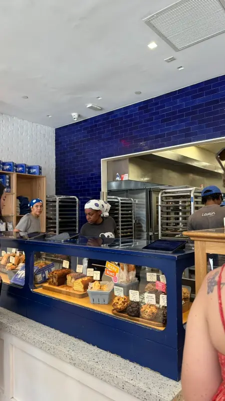 르뱅 베이커리 매장 전경, 푸른색 타일 벽이 인상적이다.