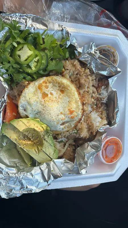드디어 기다리고 기다리던 음식이 나왔다. 가장 먼저 눈에 들어온 것은 닭고기, 계란, 아보카도가 듬뿍 올라간 볶음밥이었다. 윤기가 자르르 흐르는 볶음밥 위에는 반숙 계란이 얹어져 있었고, 신선한 아보카도와 채소가 함께 প্লে팅되어 있었다. 한 입 맛보니, 짭짤하면서도 고소한 맛이 입안 가득 퍼져 나갔다. 특히, 반숙 계란의 노른자를 톡 터뜨려 볶음밥과 함께 먹으니 그 맛이 더욱 환상적이었다.