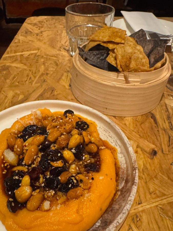그중에서도 단연 눈길을 끄는 것은 ‘카모티토(Camotito)’입니다. 고구마 퓨레 위에 각종 견과류와 건포도, 참깨가 아낌없이 뿌려져 마치 예술 작품을 보는 듯한 비주얼을 자랑합니다. 샛노란 고구마 퓨레의 부드러움과 견과류의 고소함, 그리고 건포도의 달콤함이 어우러져 한 입 맛보는 순간, 혀끝에서 다채로운 맛의 향연이 펼쳐집니다. 여기에 곁들여지는 옥수수칩과 검은색 칩은 각각 다른 질감과 풍미로 식전 입맛을 더욱 풍성하게 만들어 줍니다. 이처럼 수에르투도의 애피타이저는 단순한 시작을 넘어, 요리에 대한 기대감을 한껏 끌어올리는 중요한 역할을 합니다.