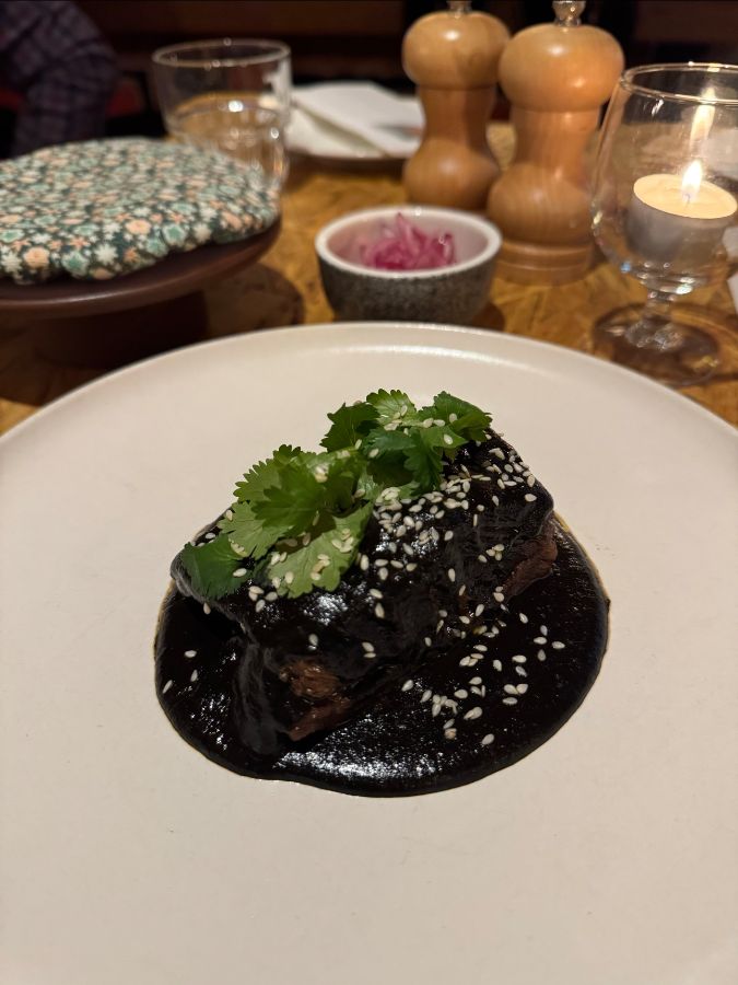 수에르투도의 메인 요리 중 빼놓을 수 없는 것은 바로 몰레 소스를 곁들인 요리입니다. 짙고 깊은 색감의 몰레 소스는 그 자체로 멕시코 요리의 정수를 보여주며, 오랜 시간 정성껏 끓여낸 소스에서 느껴지는 복합적이면서도 부드러운 풍미는 감탄을 자아냅니다. 고기 위에 뿌려진 몰레 소스와 참깨, 그리고 신선한 고수가 어우러져 한층 더 깊이 있는 맛을 선사합니다. 이 요리는 멕시코 현지 오아하카에서 3주를 보냈던 방문객마저 “아일랜드 더블린에서 먹어본 것 중 가장 비슷한 곳”이라고 평할 정도로 정통성에 대한 자신감을 드러냅니다.