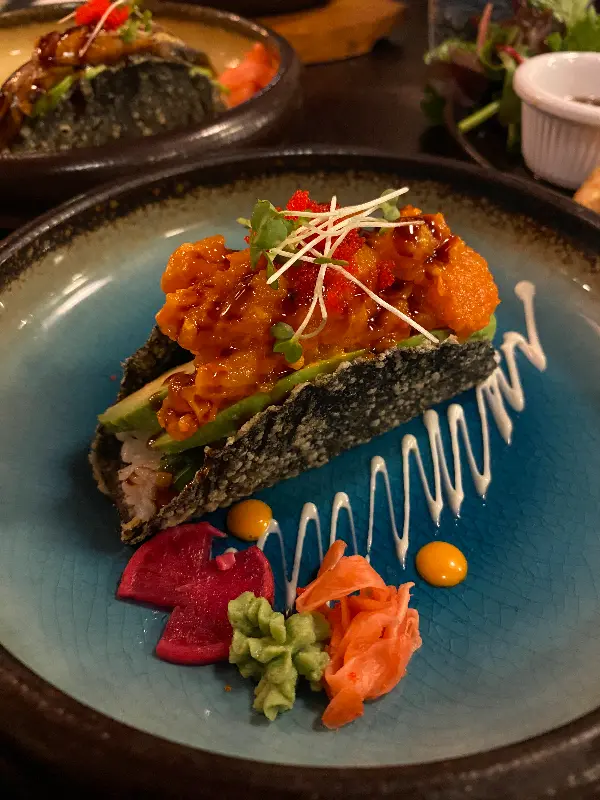 김, 아보카도, 그리고 신선한 해산물의 완벽한 조화, 스시 타코의 매력에 빠져보자.