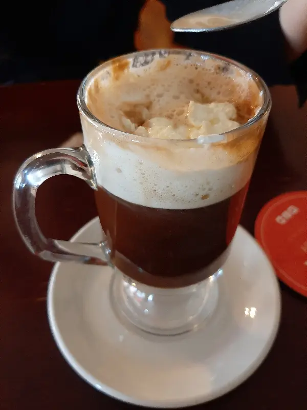 드디어 아이리시 커피가 나왔다. 잔을 감싸 쥔 손으로 전해지는 따뜻함과 코끝을 간지럽히는 위스키 향이 기대감을 고조시켰다. 한 모금 마시자, 예상보다 강렬한 술맛이 입안을 가득 채웠다. 위스키에 커피를 살짝 탄 듯한 느낌. 술을 잘 못 마시는 사람에게는 다소 부담스러울 수 있겠다는 생각이 들었다. 하지만 나에게는 오히려 그 강렬함이 매력적으로 다가왔다. 쌉쌀한 커피와 묵직한 위스키의 조화는, 더블린의 밤을 더욱 특별하게 만들어 주었다.