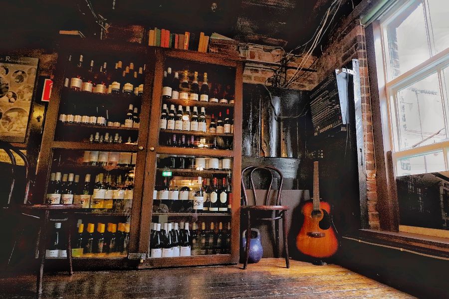 벽 한쪽에는 다양한 종류의 술병이 가득 진열된 나무 선반이 놓여 있습니다. 오랜 세월의 흔적이 느껴지는 나무의 질감과 빛바랜 술병 라벨이 묘한 조화를 이루며, 펍의 깊이를 더합니다. 기타가 한켠에 놓여 있는 것으로 보아, 때로는 라이브 음악 공연도 펼쳐지는 듯합니다.