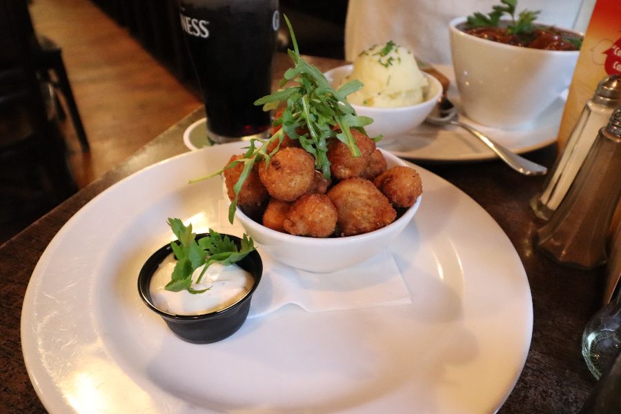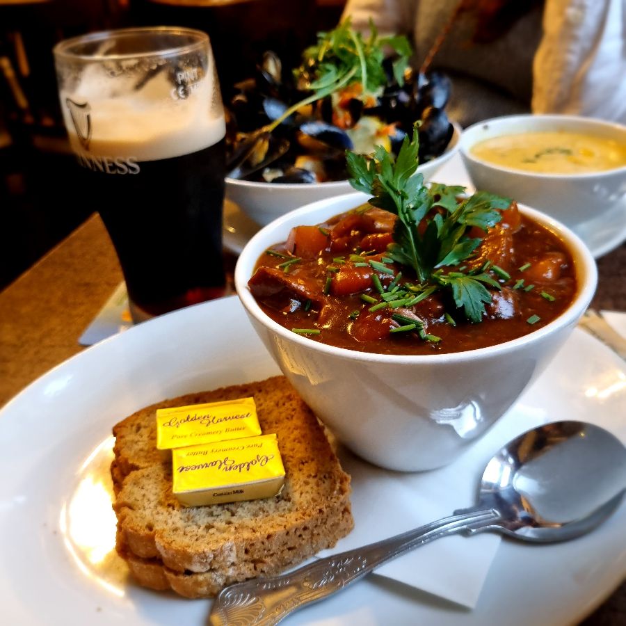 자리에 앉아 메뉴를 살펴보니, 아일랜드 전통 음식들이 눈에 띄었습니다. 그중에서도 가장 궁금했던 기네스 비프 스튜와 버섯 튀김을 주문했습니다. 잠시 후, 따뜻한 김이 모락모락 나는 스튜가 테이블에 놓였습니다.