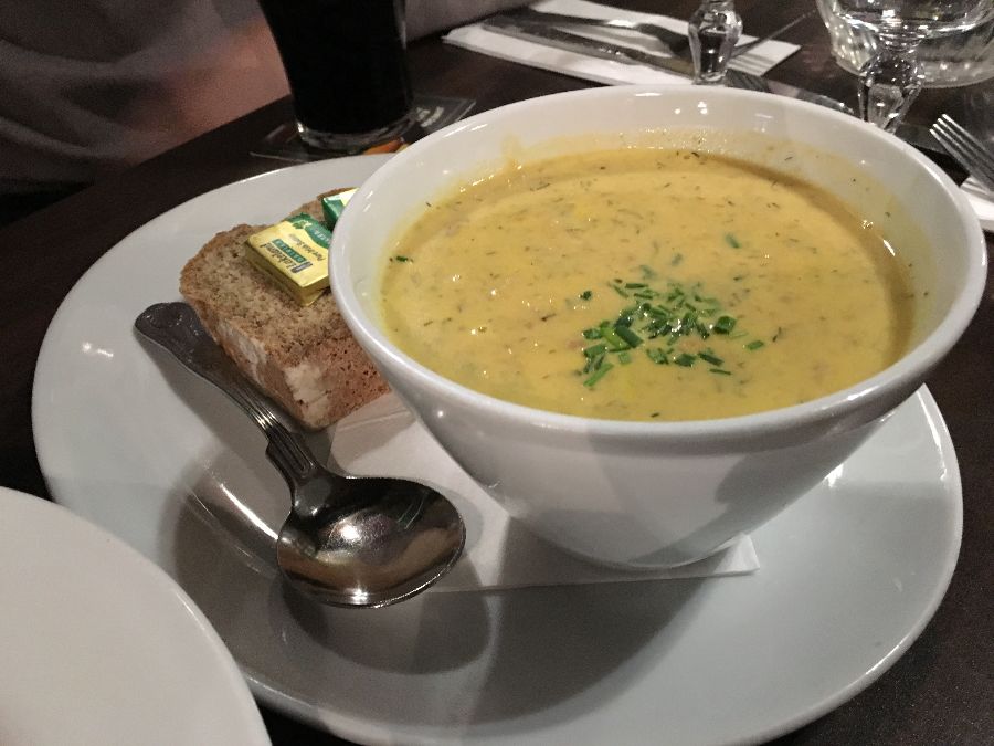 또 다른 날, 비가 추적추적 내리는 더블린 거리를 걷다가 따뜻한 국물이 생각나 다시 그 펍을 찾았습니다. 이번에는 Seafood Chowder(해산물 차우더)를 주문했습니다. 커다란 그릇에 담겨 나온 차우더는 보기만 해도 푸짐했습니다. 홍합, 새우, 조개 등 다양한 해산물이 듬뿍 들어 있었고, 크리미한 스프는 따뜻하고 부드러웠습니다.