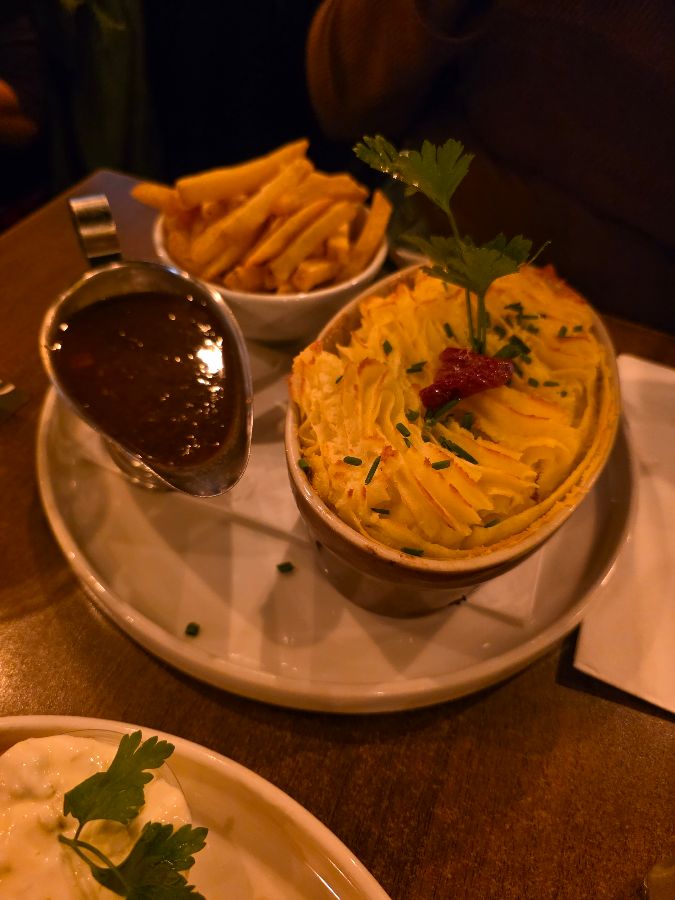 셰퍼드 파이를 한 입 베어 물자, 입 안 가득 풍미가 퍼져 나갔습니다. 부드러운 감자와 양고기의 조화는 환상적이었습니다. 기네스 스튜는 빵을 찍어 먹으니 더욱 맛있었습니다. 맥주와 함께 곁들이니 그 맛이 배가되었습니다. 음식이 조금 짠 편이라는 평도 있지만, 맥주와 함께 먹으니 전혀 문제가 되지 않았습니다. 오히려 맥주를 더 부르는 맛이었습니다. 윙 또한 살짝 짠맛이 느껴졌지만, 짭짤한 윙과 시원한 맥주의 조합은 언제나 옳았습니다. 특히 이곳의 감자튀김은 겉은 바삭하고 속은 촉촉하여 잊을 수 없는 맛이었습니다.