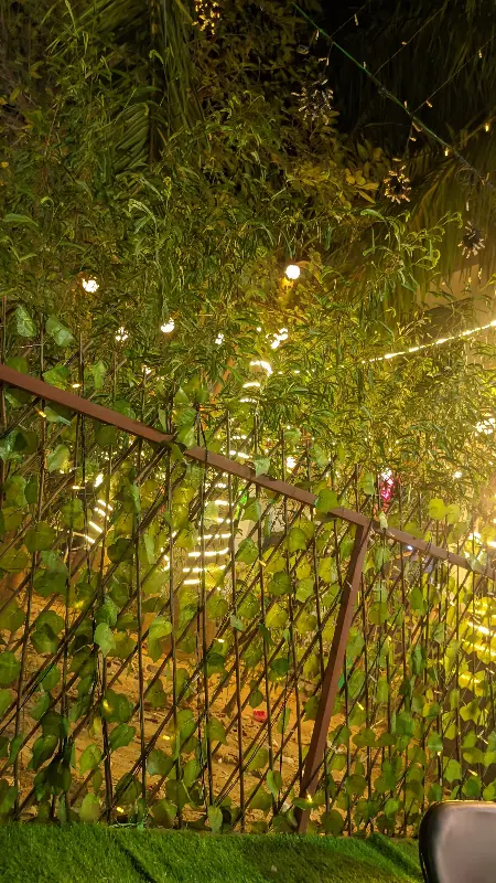 저녁 시간, 은은한 조명 아래 빛나는 오가닉 다바의 야외 공간입니다. 푸르른 식물들과 조명이 어우러져 아늑한 분위기를 자아냅니다.