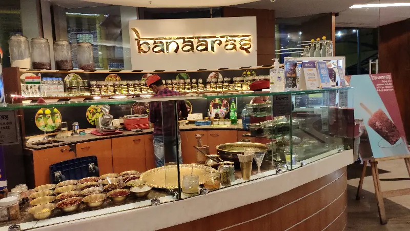 ‘banaaras’ 매장의 모습. 인도 전통 간식과 음료를 판매하는 곳으로, 화려한 장식과 다채로운 색감이 인상적이다.