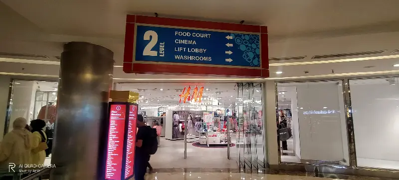 푸드코트 안내 표지판. 2층에 위치해 있으며, 영화관 및 편의시설과 함께 자리하고 있음을 알 수 있다.