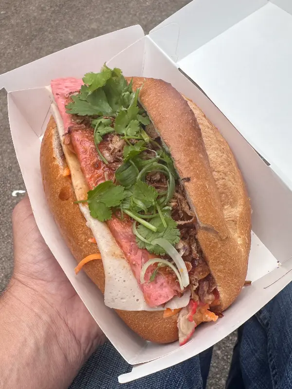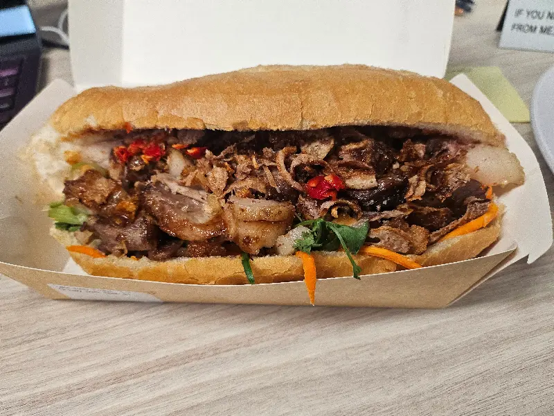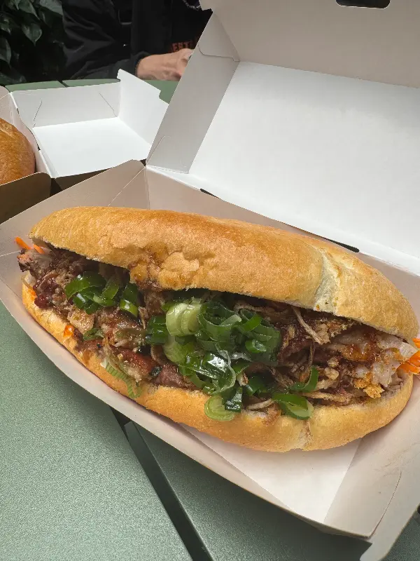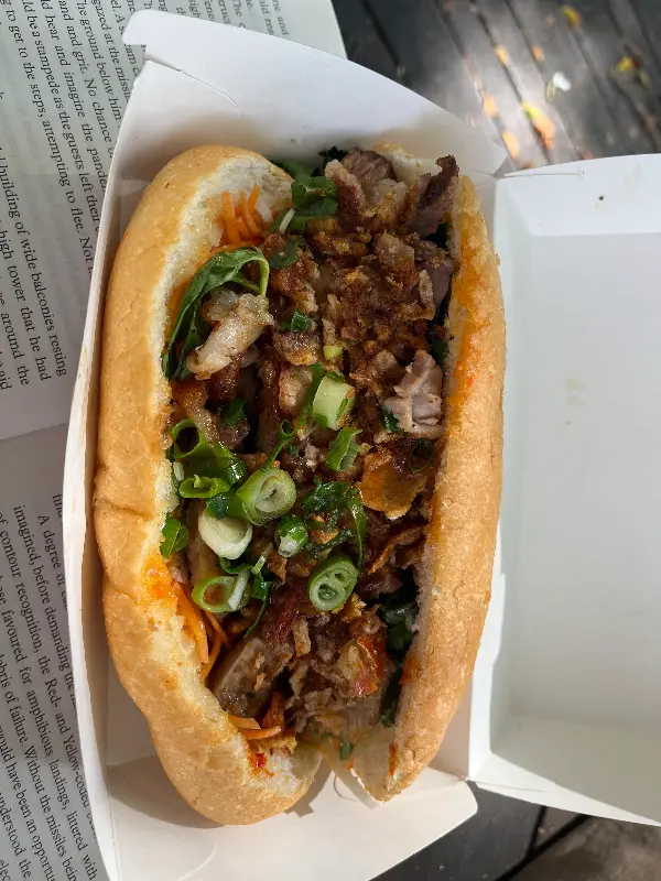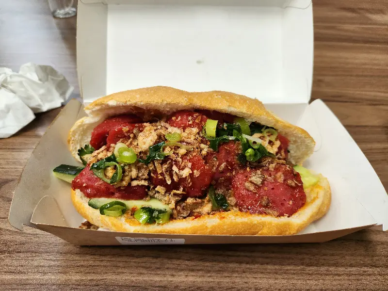 주문한 반미를 받아 들고 자리에 앉았다. 바삭한 빵의 질감이 손끝으로 느껴진다. 한 입 베어 물자, 겉은 바삭하고 속은 촉촉한 빵의 식감이 입안 가득 퍼진다. 이어서 짭짤하면서도 고소한 돼지고기의 풍미가 느껴지고, 신선한 채소의 아삭함이 더해져 완벽한 조화를 이룬다.