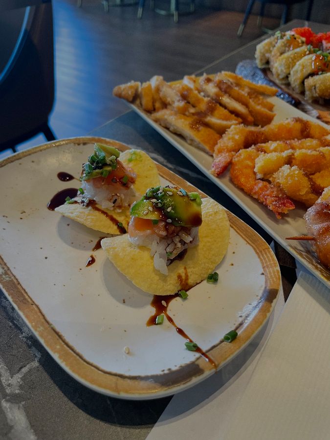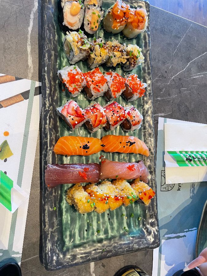 접시 위로 펼쳐진 스시들은 그야말로 예술 작품입니다. 다채로운 색감의 생선회와 토핑, 정교하게 말아 올린 롤의 향연은 시각적인 즐거움부터 선사합니다. 붉은 참치, 주황빛 연어, 새하얀 광어살, 그리고 각양각색의 날치알과 아보카도, 딸기까지. 평범함을 거부하는 Kyuden의 스시는 단순한 음식을 넘어 오감을 자극하는 미식 경험을 제공합니다. “스시는 신선하고, 보기에도 예쁘고, 맛도 좋아요”라는 평가는 이곳의 스시가 가진 모든 매력을 한 문장으로 요약합니다.