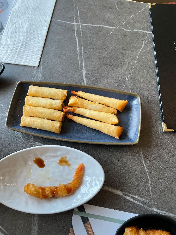 Kyuden은 단순히 스시만 잘하는 곳이 아닙니다. 다양한 전채 요리, 밥, 면 등 다채로운 메뉴를 제공하는 고급 뷔페 레스토랑으로서의 면모를 자랑합니다. 얇고 바삭하게 튀겨낸 새우 춘권과 통통한 새우튀김은 스시와는 또 다른 매력으로 입맛을 돋웁니다. 금방 튀겨져 나온 따끈한 튀김류는 바삭한 겉과 촉촉한 속이 어우러져 훌륭한 에피타이저가 됩니다. 한 입 베어 물면 고소함이 입안 가득 퍼지며 다음 요리를 기대하게 만듭니다.