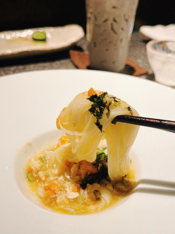 한 점 한 점 나올 때마다 섬세한 칼집과 예술적인 가니쉬로 꾸며진 생선회는 눈으로 즐기는 즐거움도 컸다. “각 요리의 디자인이 매우 정교하고 스타일이 다양하며 맛도 다르다”는 말처럼, 신둘리에서는 미각뿐 아니라 시각, 후각까지 모든 감각이 만족하는 경험을 할 수 있었다. 셰프님은 손님들의 식사 속도를 고려하며 적절한 타이밍에 다음 요리를 내어주었고, 이는 진정으로 편안하고 즐거운 식사 분위기를 만들었다.