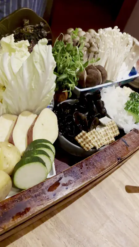 자리에 앉자 곧바로 불 냄비가 준비되었다. 뚜껑을 열자마자 눈 앞에 펼쳐진 것은, 마치 예술 작품과도 같은 아름다운 비주얼이었다. 배 모양의 독특한 그릇에 형형색색의 채소와 버섯, 그리고 각종 재료들이 가득 담겨 있었다.