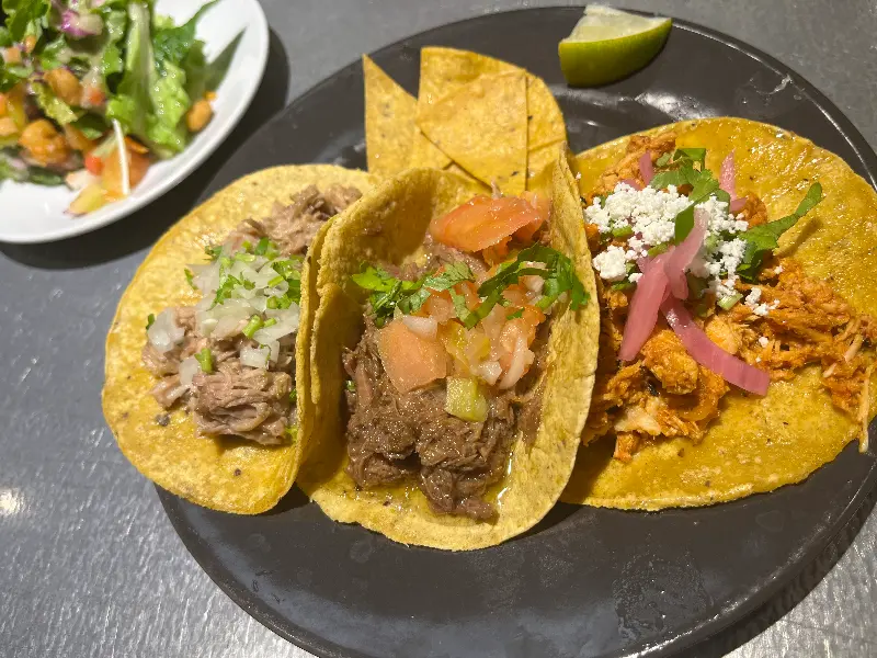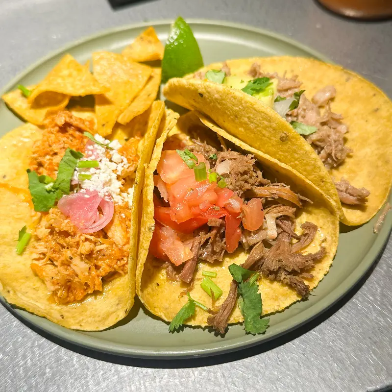눈으로도 즐거운 타코 3종 세트. 다채로운 색감과 신선한 재료가 입맛을 돋우는 완벽한 조화를 이룹니다.