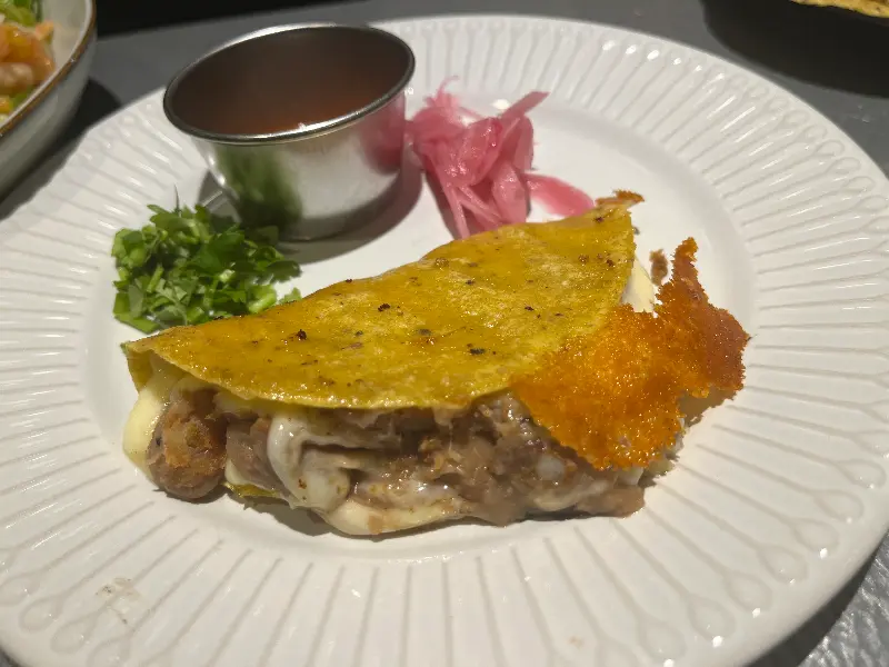 케사디야(포크)는 치즈와 돼지고기의 달콤한 조화가 인상적입니다. 한 입 베어 물면 치즈의 고소함과 돼지고기의 풍미가 입안 가득 퍼지면서, “또 한 장”을 외치게 되는 마성의 매력을 지녔습니다.
