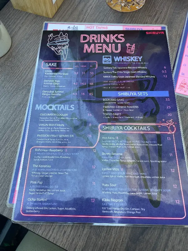 테이블에 앉아 메뉴판을 펼쳐 들었다. 사케, 위스키, 칵테일 등 다양한 주류와 함께 스시, 롤, 튀김 등 맛있는 일본 음식들이 가득했다. 특히 눈길을 사로잡는 것은 시부야 세트 메뉴였다. 이것저것 고민할 필요 없이, 이 곳의 대표 메뉴들을 한 번에 맛볼 수 있다는 점이 매력적이었다. 메뉴판 디자인 또한 어두운 배경에 네온 컬러로 포인트를 주어 시부야의 밤거리를 연상시키는 듯했다.