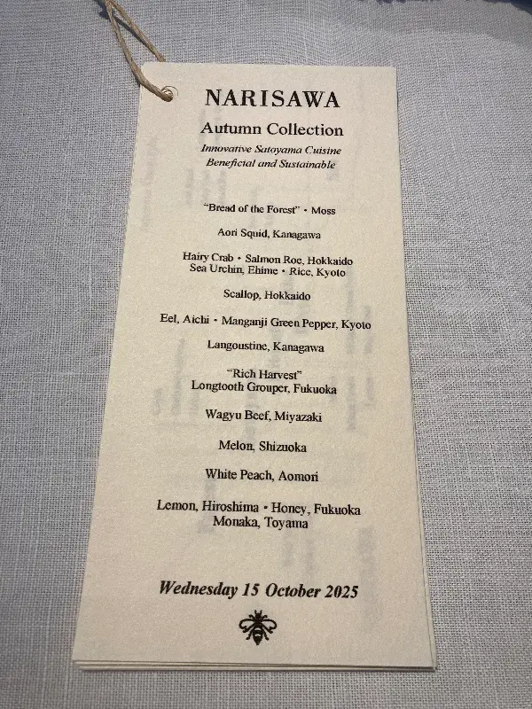 아내와 함께 방문했던 그 날, 저희는 ‘가을 컬렉션: 혁신적인 사토야마 요리’를 맛보는 행운을 누렸습니다. 나리사와는 프렌치나 일식과는 확연히 다른, 독자적인 창작 요리를 선보이는 곳입니다. 특히 ‘사토야마 요리’는 숲과 바다를 존중하는 마음을 담아, 자연의 재료를 섬세하게 표현한 것이 특징입니다.