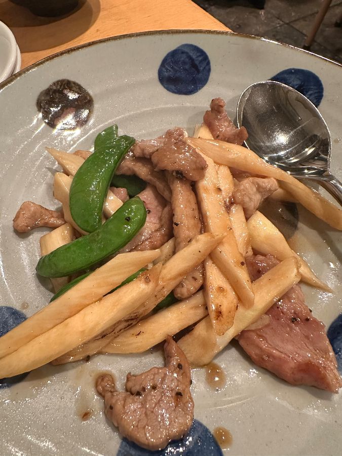 다음으로 맛본 요리는 돼지고기와 죽순 볶음이었습니다. 아삭한 죽순과 부드러운 돼지고기가 어우러져 담백하면서도 깊은 맛을 냈습니다. 큼지막한 죽순 조각과 큼직하게 썰린 돼지고기가 푸짐하게 담겨있어 보는 즐거움까지 더했습니다.