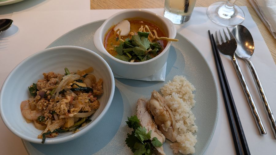가장 인상 깊었던 메뉴 중 하나는 바로 그린 카레였습니다. 부드러운 코코넛 밀크 베이스에 은은하게 퍼지는 향신료의 풍미가 일품이었습니다. 한 숟가락 입에 넣으면, 처음에는 부드러운 단맛이 느껴지다가 이내 코끝을 스치는 매콤함이 입맛을 돋웁니다. 밥과 함께 비벼 먹으면 그 조화가 더욱 빛을 발합니다. 그리고 기대했던 카오소이를 맛볼 수 있었던 것은 정말 큰 기쁨이었습니다. 바삭한 튀김 면과 부드러운 삶은 면이 함께 어우러진 카오소이는 진하고 고소한 코코넛 카레 육수와 완벽한 하모니를 이룹니다. 육수의 깊은 맛과 다채로운 면의 식감이 조화를 이루며, 한 입 한 입이 감탄을 자아냅니다.