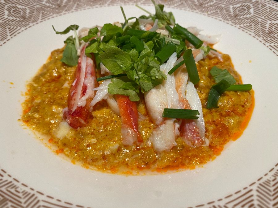 뷔페에서 맛볼 수 있었던 요리 중에서도 단연 돋보였던 것은 신선한 해산물 요리였습니다. 특히 게살이 풍성하게 올라간 커리 요리는 부드러우면서도 짭짤한 커리 소스와 달콤한 게살의 조화가 환상적이었습니다. 향긋한 고수와 쪽파가 더해져 풍미를 한층 끌어올리며, 입안 가득 퍼지는 고소함과 은은한 매콤함이 다음 한 입을 더욱 기대하게 만들었습니다. 이처럼 망고 트리 도쿄는 단순한 뷔페가 아니라, 개별 요리 하나하나에 정성을 들여 최고의 맛을 선사하는 곳임을 알 수 있었습니다.