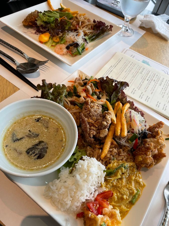 뷔페 코너에는 카오만가이, 팟타이, 톰얌면, 가파오, 그린 카레 등 태국 요리의 단골 메뉴들이 먹음직스럽게 놓여 있습니다. 뿐만 아니라 소프트 쉘 크랩 튀김, 해산물 샐러드 등 흔히 접하기 어려운 특별한 메뉴들까지 다채롭게 준비되어 있었습니다. 한 접시 가득 담아온 요리들은 보기만 해도 눈과 코를 즐겁게 합니다. 볶음밥의 고슬고슬한 식감과 새우의 탱글함, 면 요리의 쫄깃함이 어우러져 입안 가득 행복감을 선사합니다.