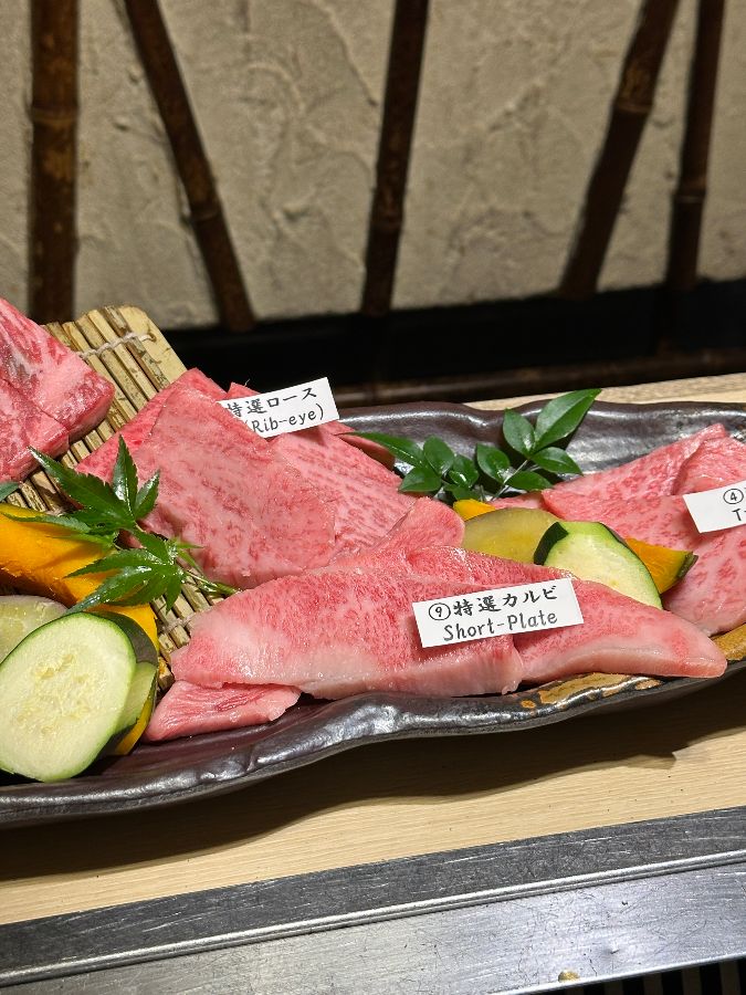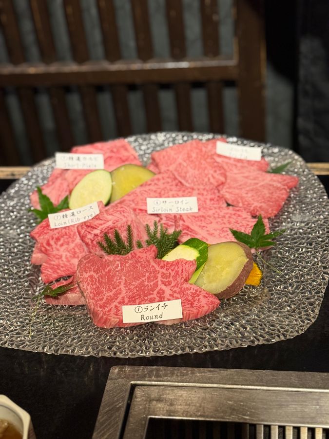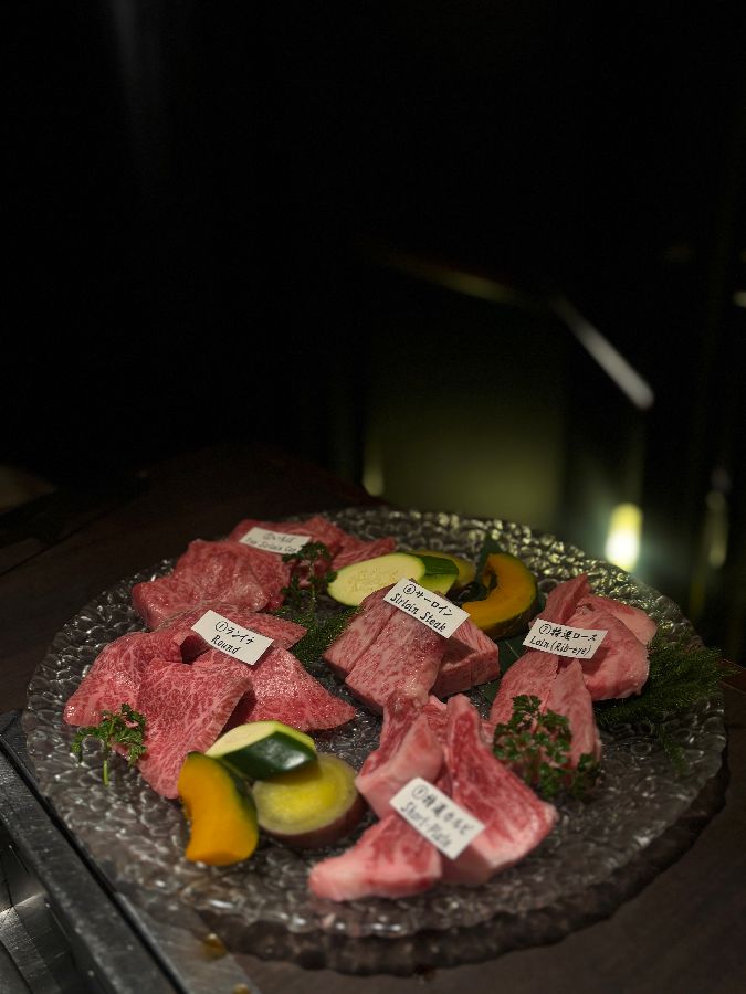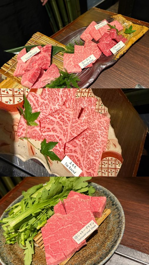 특히, 살치살(Chuck Flap)이나 채끝등심(Sirloin Steak), 립아이(Rib-eye), 쇼트 플레이트(Short-Plate) 같은 특선 부위들은 보기만 해도 입안에 침이 고일 정도로 먹음직스러웠습니다. “마츠자카규는 육즙이 풍부하고 부드러워서 입안에서 사르르 녹았고, 고기 본연의 풍미가 살아 있어 정말 맛있었습니다”라는 리뷰처럼, 아직 불판에 오르기도 전인데도 그 압도적인 비주얼만으로도 기대감이 최고조에 달했습니다. 고기 한 점 한 점에 붙여진 이름표는 각 부위의 특징을 미리 알 수 있게 하여, 맛을 더욱 깊이 음미할 수 있도록 도왔습니다.