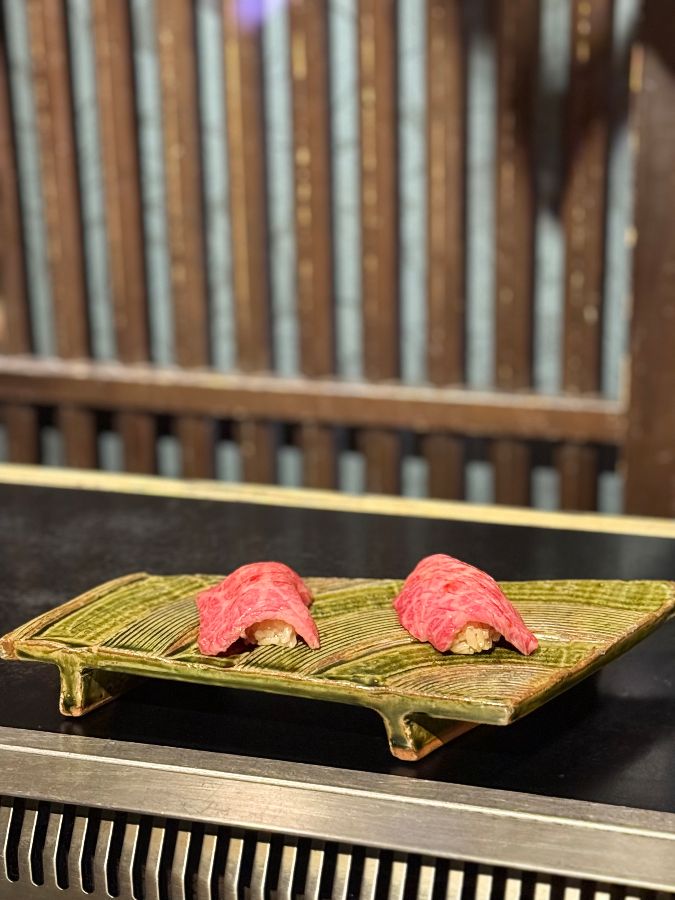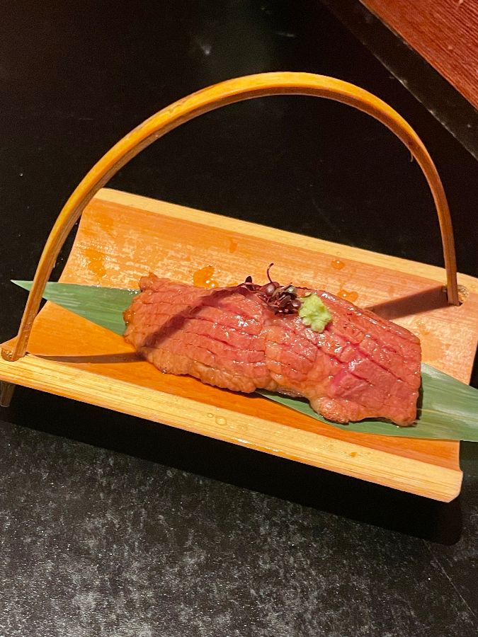 코스에 포함된 마츠자카규 니기리 스시는 식사의 시작을 알리는 특별한 애피타이저였습니다. 얇게 저민 와규가 따뜻한 밥 위에 살포시 얹어져 있었는데, 그 섬세한 자태는 마치 작은 보석 같았습니다. 이어진 살치살 같은 부위는 정갈한 나무 접시에 소량씩 담겨 나와, 한 점 한 점을 더욱 소중하게 느껴지게 했습니다.