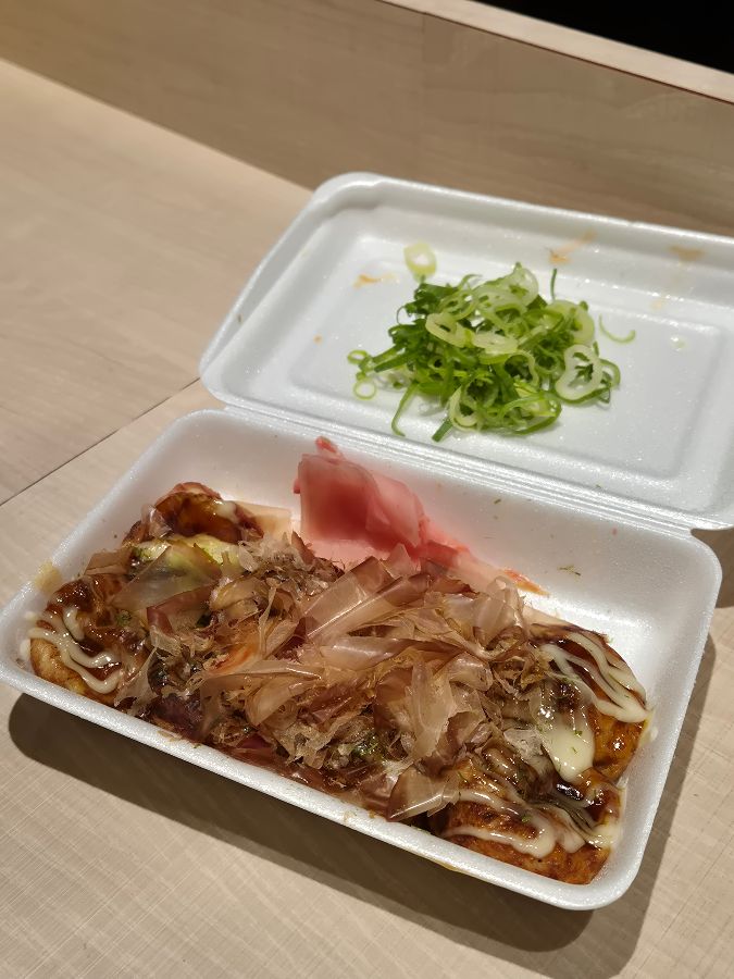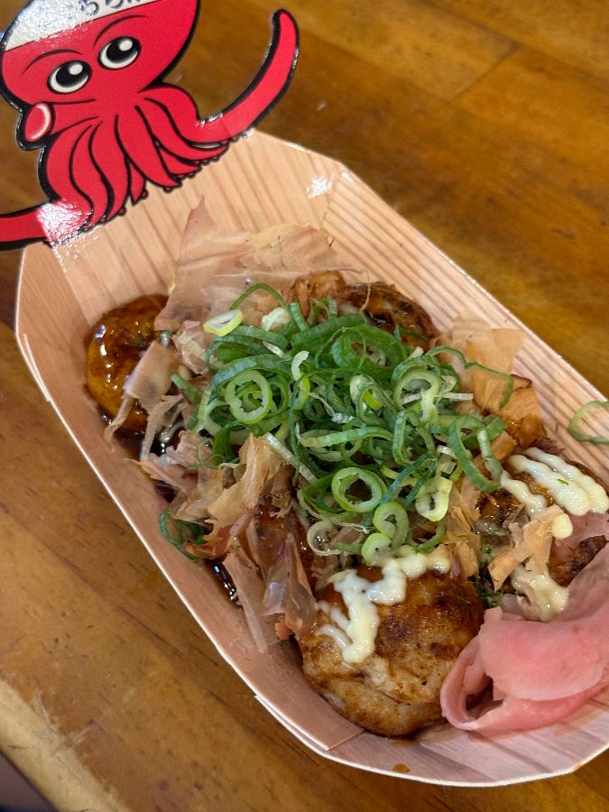 갓 구워 뜨거운 타코야끼 위에 푸짐하게 올라간 파와 가쓰오부시, 그리고 마요네즈와 소스가 군침을 돌게 합니다.
