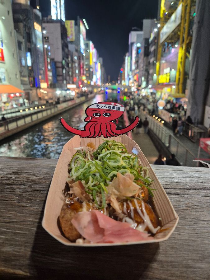 도톤보리 강변을 배경으로 찍은 타코야끼 사진입니다. 밤하늘의 화려한 도시 불빛과 어우러져 더욱 특별한 맛을 선사합니다.