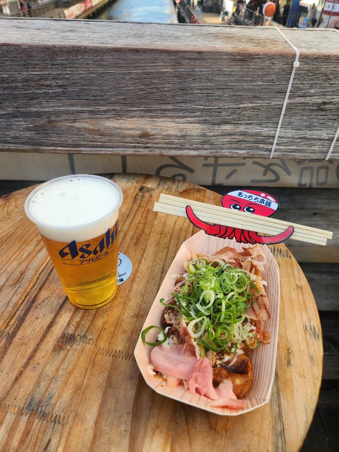 도톤보리 강변에서 시원한 아사히 맥주와 함께 즐기는 아치치혼포 타코야끼는 여행의 즐거움을 더해줍니다.
