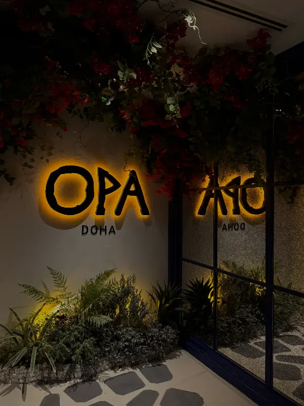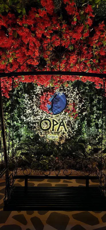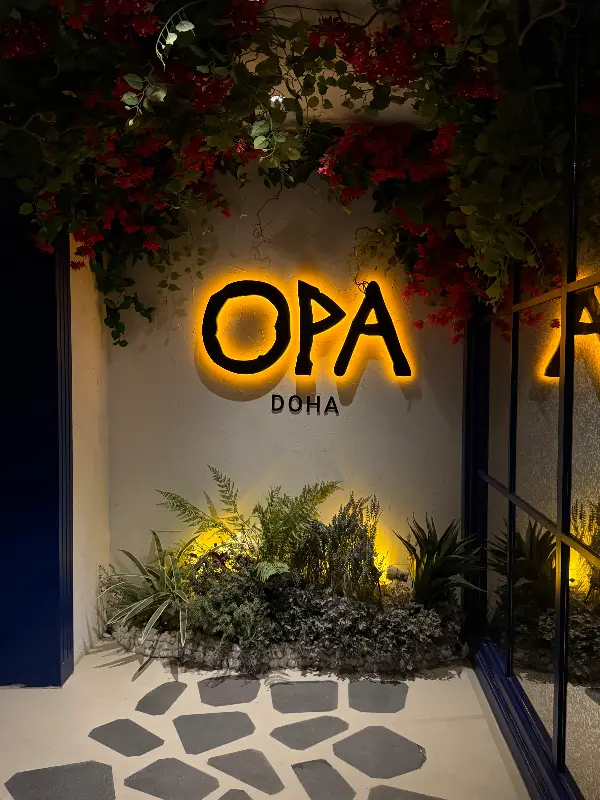 레스토랑 입구부터 시선을 사로잡는 것은 단연 OPA DOHA라는 빛나는 로고였다. 따뜻한 조명과 주변을 장식한 푸른 식물들은 마치 그리스의 작은 정원에 들어선 듯한 착각을 불러일으켰다. 돌길을 따라 안으로 들어서자, 활기 넘치는 음악과 사람들의 웃음소리가 기대감을 더욱 고조시켰다.